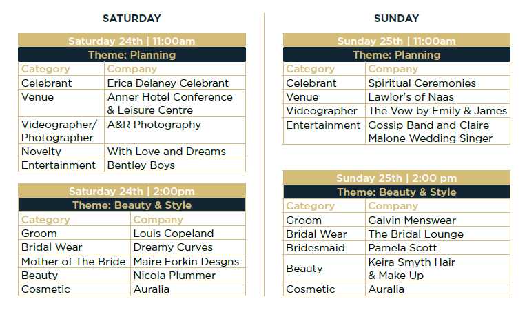 The Wedding Show is the perfect opportunity to meet with a wide range of leading wedding experts across every category imaginable. We know how stressful planning your big day can be so, don’t waste your time ringing around, come to The Wedding Show at The RDS where everything is under one roof. Our experts are on hand to offer invaluable advice and inspiration for your special day.